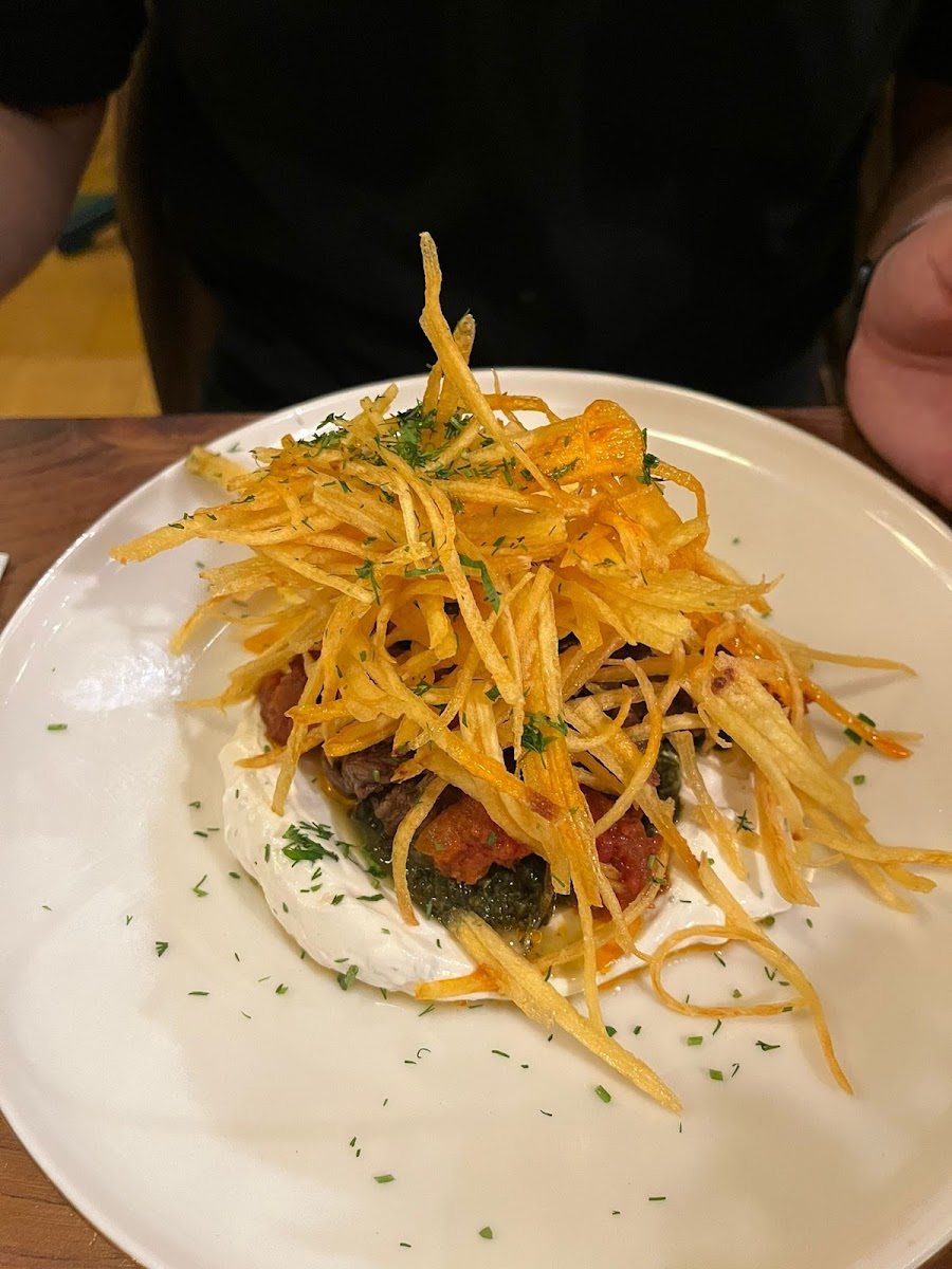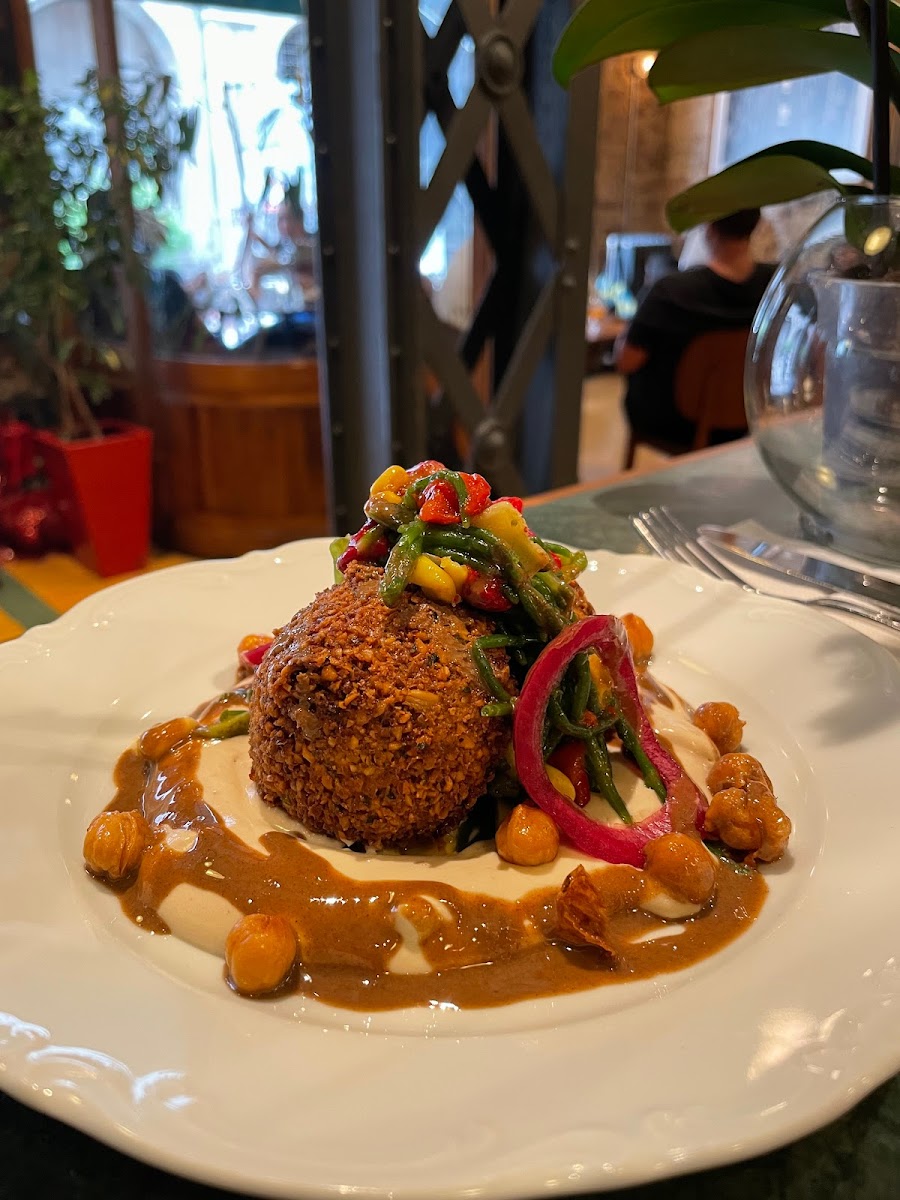 Just over the Galata Bridge but tucked away, with outdoor tables on the sidewalk but a nice patio well off the street and an inside dining room with tall stone walls. Food and service were excellent. I dined alone but overheard the table next b to me and we agreed on the quality of both dinner and dessert. I had grilled meatballs (beef and lamb in a traditional sausage shape) with Mutebbel, which is crispy eggplant with a yummy mideastern sauce. A really nice experience for my n first night in Istanbul.